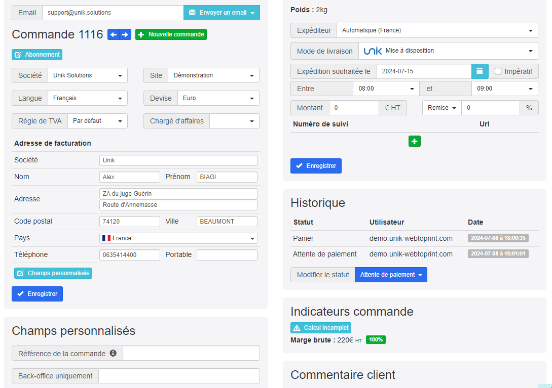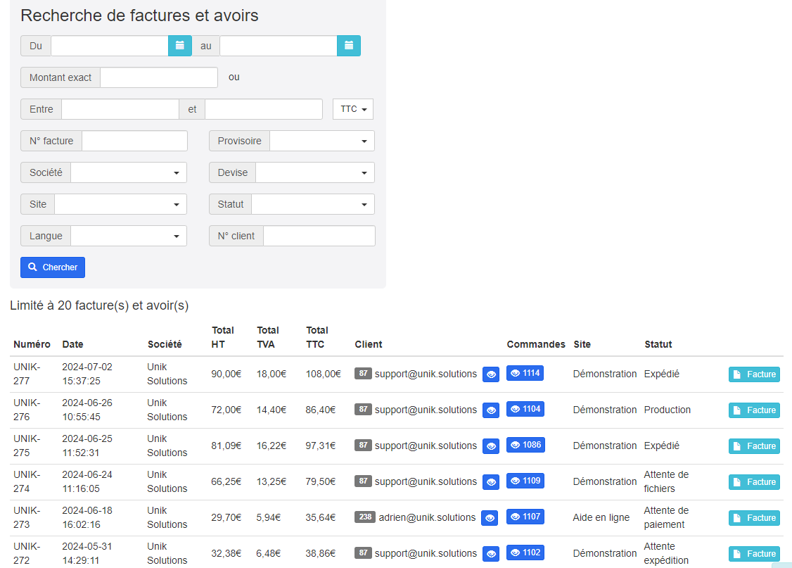 Unik propose un outil de suivi des commandes conçu pour optimiser la gestion commerciale de votre enseigne multi-localisée. Grâce à un moteur de recherche ultra performant et à une page dédiée pour chaque commande, où les informations affichées sont personnalisables, vous pouvez accéder rapidement à toutes les informations nécessaires.