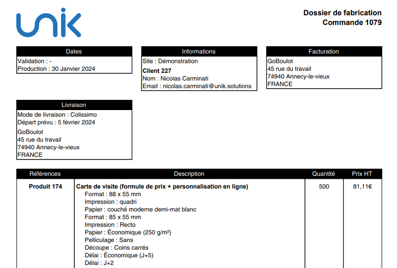 Il est automatiquement généré en format PDF lorsque le statut d’une commande passe à « Production » et accessible au ayant droits depuis la fiche commande ainsi que dans le sous-menu « Expéditions » de votre back-office.